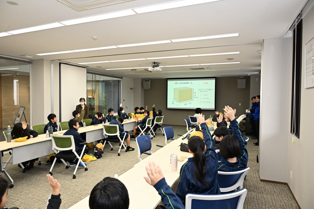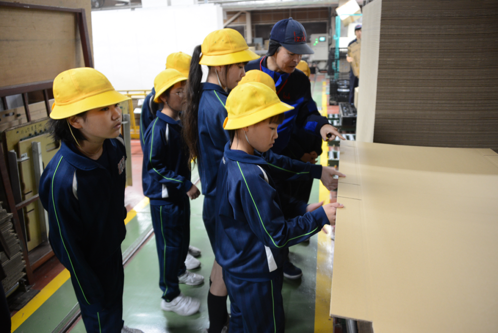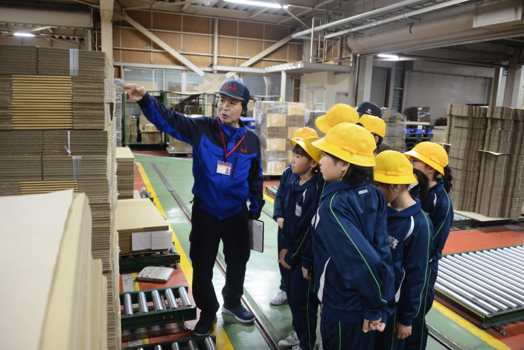 11月13日・19日の2日間に分けて、よつば小学校(富山県魚津市)5年生の児童が アイザック パッケージ事業本部 の工場見学のため来社されました。クイズを交えながらダンボールについて知っていただいた後、工場内で実際にダンボールができる様子を見学しました。みなさん積極的に手を挙げて発表や質問をしてくださり、ダンボールやものづくりについて楽しく学んでいただける機会となりました。